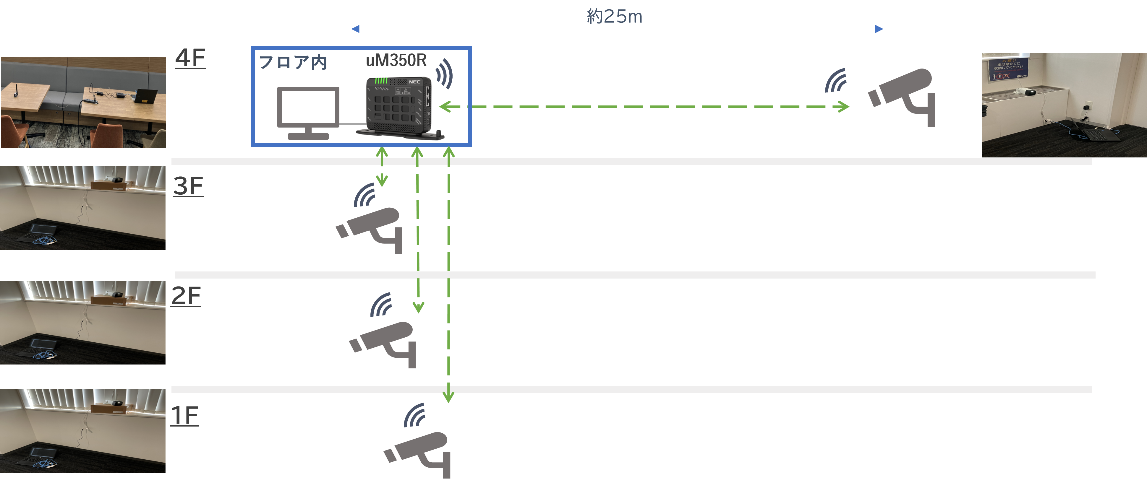 ビルのフロア20FにuM350Rを設置し、離れた子機と疎通確認を行った。