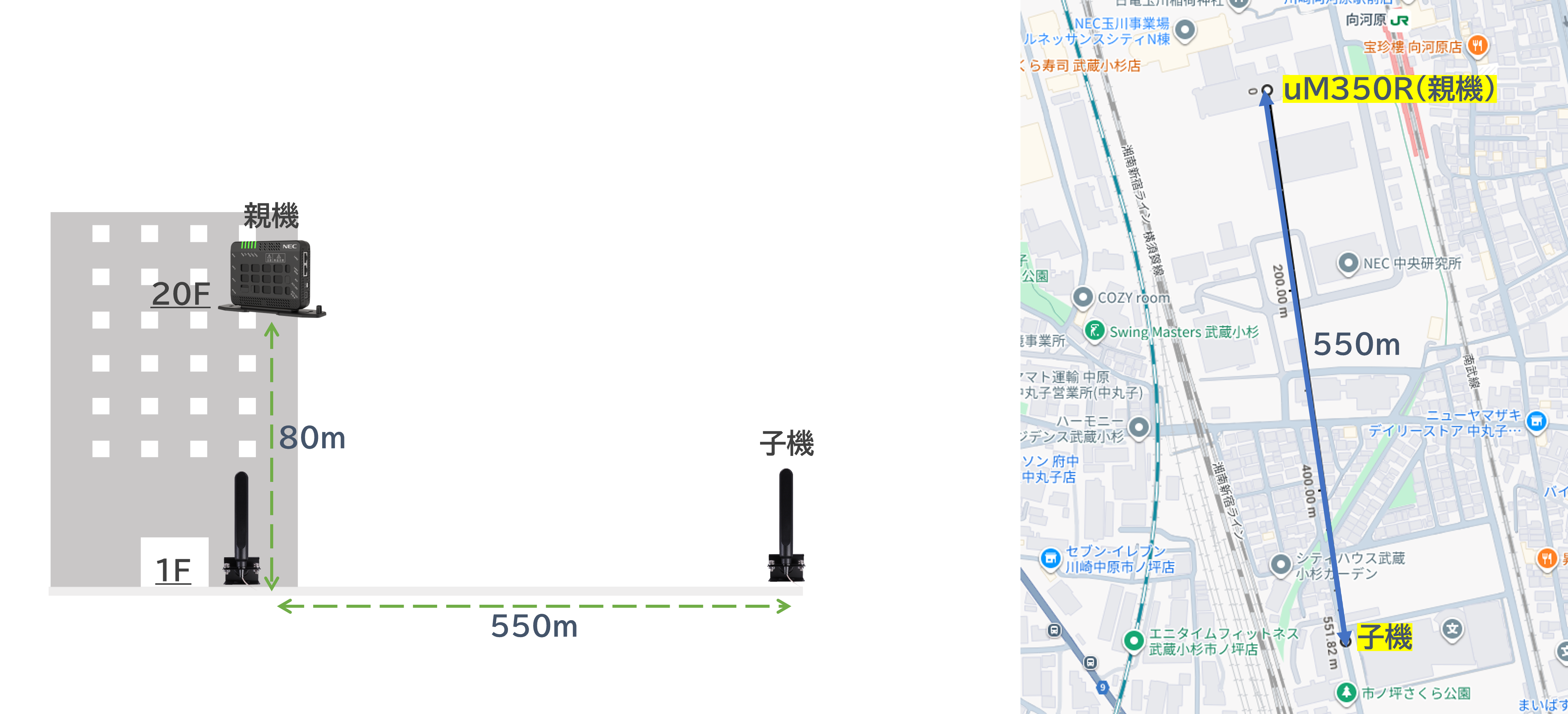 | 検証② | 親機(uM350R)をビルの高いところに設置した場合の通信距離を確認 |