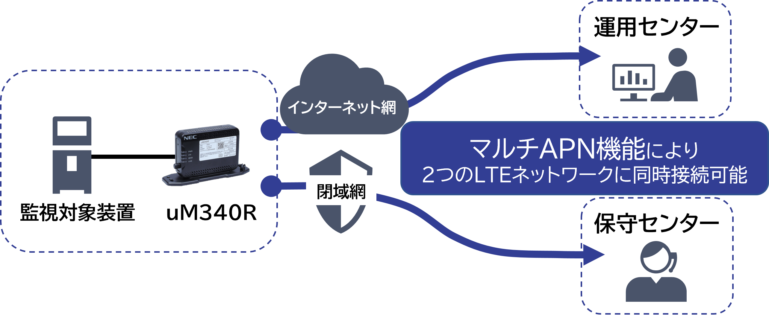 uM340RのマルチAPN機能を使用することで、SIM1枚でAPNを2つまで設定でき、同時接続・同時通信が可能です。